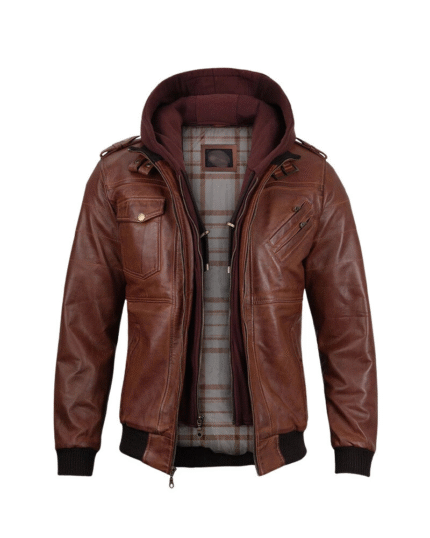 Mens Brown Hooded Stylish Bomber Leather Jacket