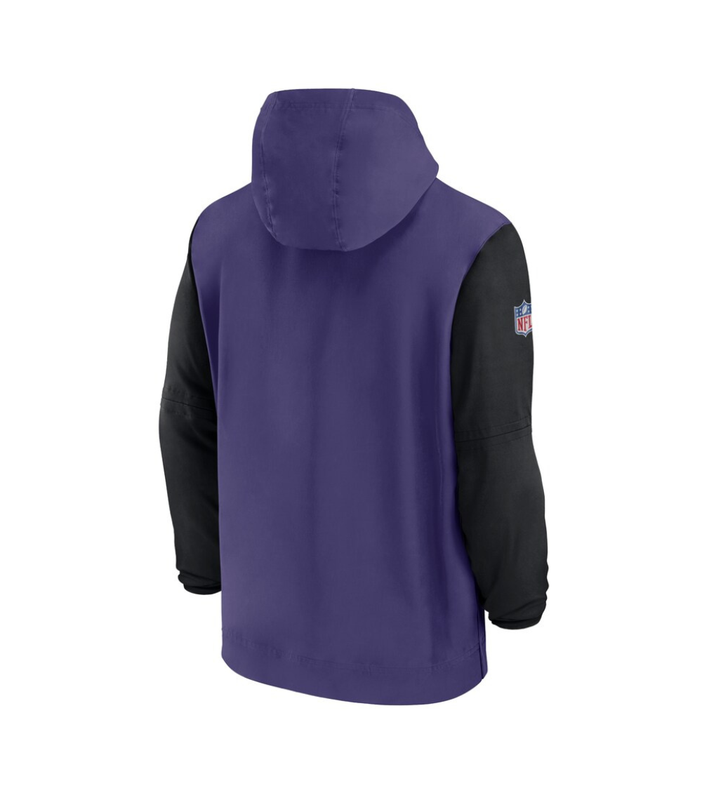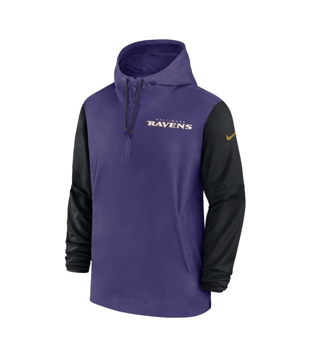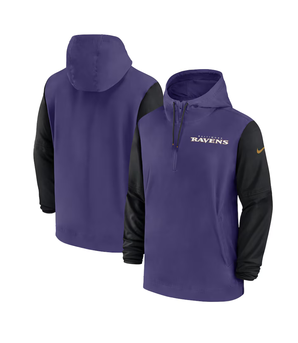 The jacket features a mesh-lined hood for breathability and a half-zip front closure design that adds both style and practicality. Zippered side pockets & split pouch options give you space to store essentials or simply warm your hands. Bold Ravens branding across the chest—and authentic Nike detailing—make this jacket unmistakably part of the official 2024 sideline collection. Perfect for cooler pre-game moments, casual Fridays, or showing off team pride every day.