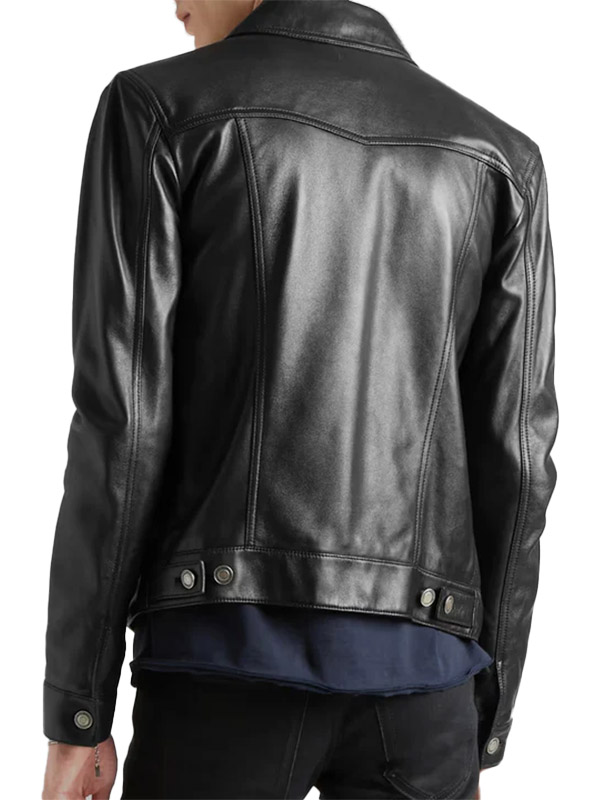 Men’s Black Sheepskin Leather Trucker Jacket. Inspired by the classic denim trucker silhouette, this jacket is reimagined in luxurious genuine sheepskin leather, giving it a sleek upgrade while maintaining its timeless appeal.
