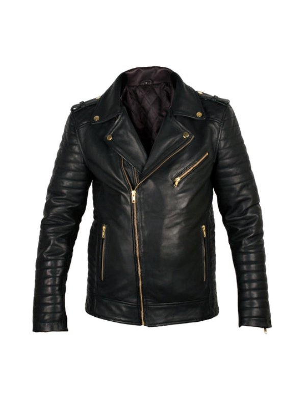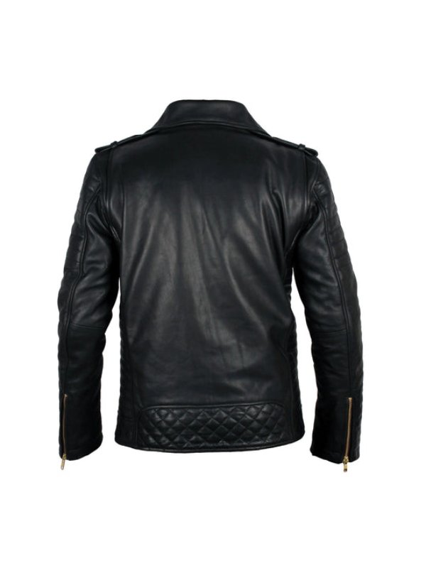 The jacket showcases quilted paneling on the shoulders and sleeves, adding both texture and a rugged moto-inspired look. Its asymmetrical front zipper closure enhances the classic biker vibe, while the sleek black finish ensures versatility, pairing effortlessly with jeans, boots, or even semi-casual attire.