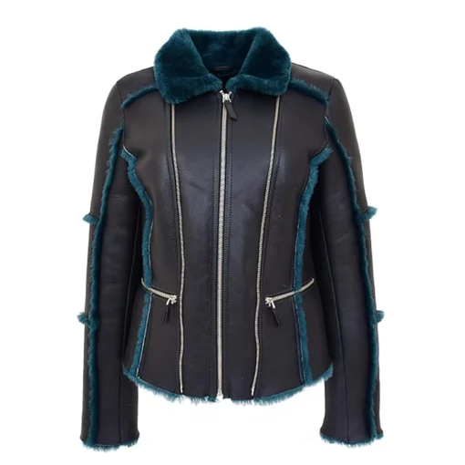 Designed with a classic aviator silhouette, it features a wide shearling collar, adjustable straps, and sturdy front zipper closure. The buckle-neck detail and functional side pockets enhance both style and practicality, while the tailored fit adds a touch of modern femininity to its rugged design.